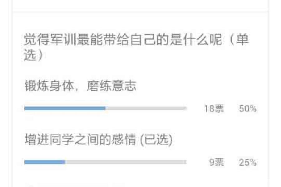 宣传组成员将同学们可能的军训感受制作成投票表,通过微信公众号、微博、贴吧发布。投票引起了同学们的共鸣感,大家积极参与,最终,“锻炼身体,磨练意志”选择项被选择最多,其次是“增进同学之间的感情”选择项。投票结果指导我们在接下来的军训中,优化训练方式以保障训练成果,同时多开展新生间交流活动,如拉歌等等。宣传组成员们及时将投票结果通过新媒体平台发布出去,同学们纷纷表示这次投票表达了自己军训的心声。