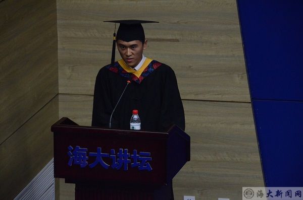随后,褚凤天同学代表学院2015届本科毕业生发言,他代表所有毕业生向母校和学院的精心培养表达了发自肺腑的感激之情,向四年来关心和照顾自己的老师和家长也表示了深深的感谢,同时他还表示,自己将会牢记海大的教诲,运用所学,继续拼搏,用卓越的未来回报母校,奉献社会。