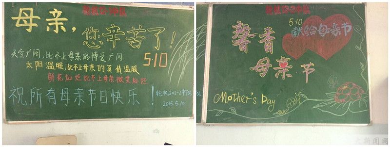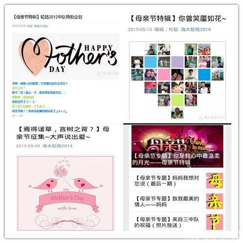轮陆2012中队和轮陆2014中队分别在中队微信平台开设母亲节特辑,进行母亲节祝福征集活动,并将征集到的祝福及与母亲的合影发布到微信平台上,借此表达对母亲的祝福与感激。轮机2012级海上各中队在中队宣传栏进行了母亲节祝福宣传,提醒同学们及时送上对母亲的祝福和关心。