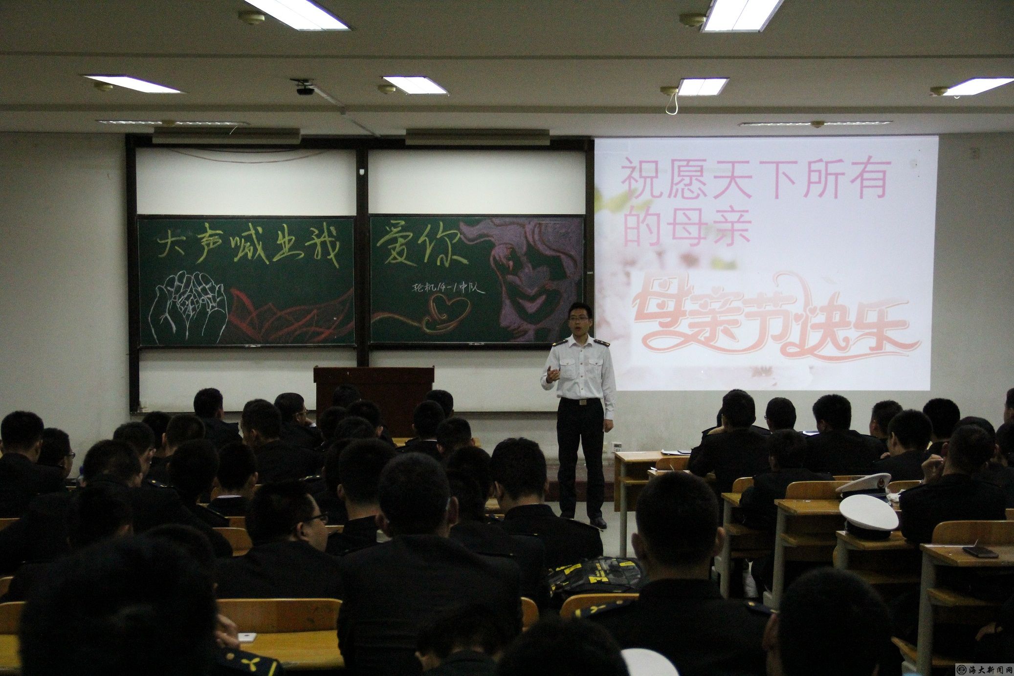 轮机2014-1中队召开了主题中队会。会上,同学们用朴实的语言与大家分享了自己与母亲间的点滴故事,感动了在场的每一位同学。随后,播放了学生家长们对自己孩子思念与希冀的视频。视频播放结束后,中队全体同学通过电话对妈妈们齐声喊出“妈妈,我爱你!”,洪亮而真挚的声音,将同学们的祝福送到了母亲的心里。