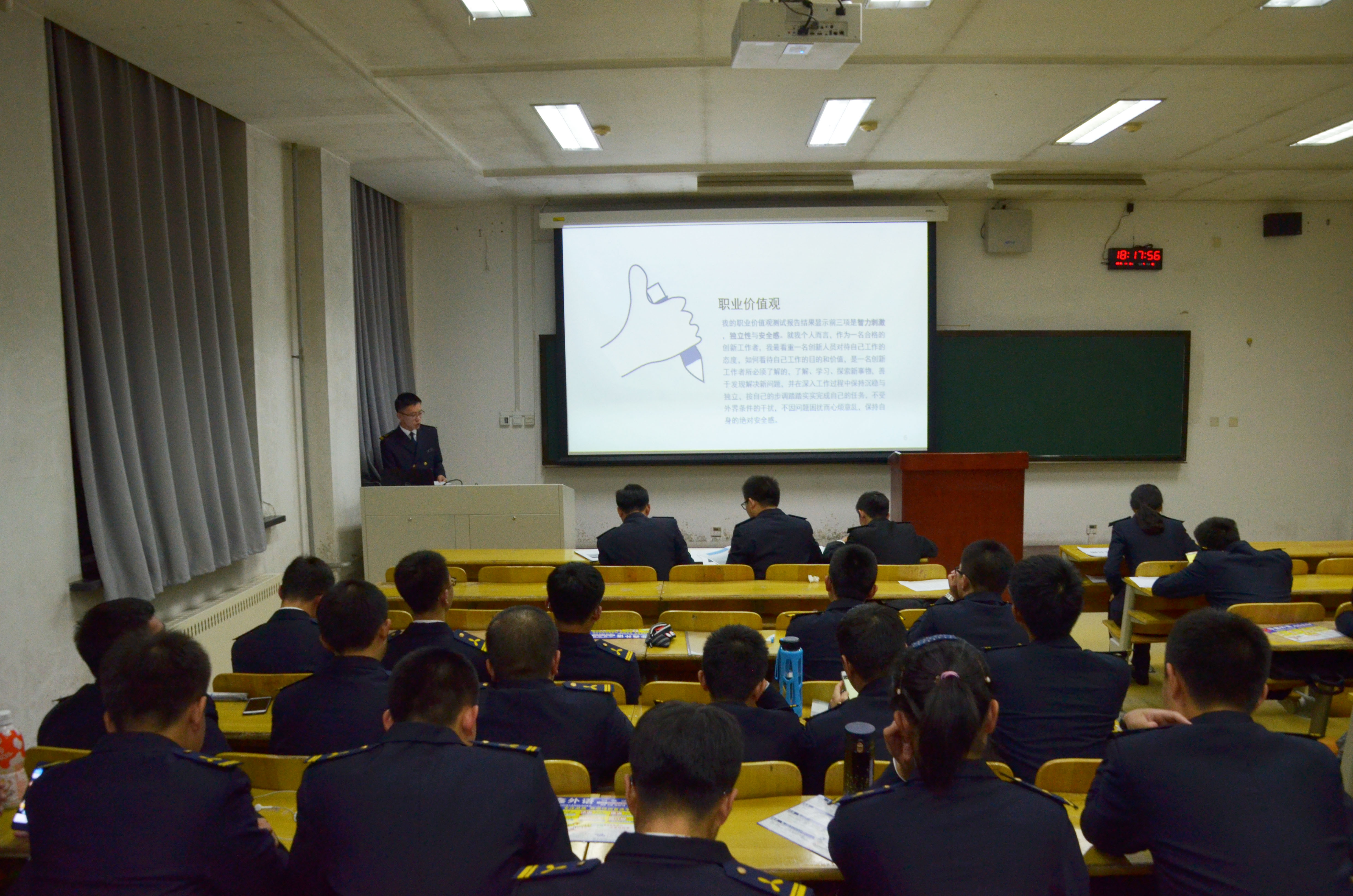 比赛开始前,2017级学生代表有序入场,参赛选手于候场区准备。接着,主持人宣布比赛开始,各选手按次序上台就自己的职业生涯规划作陈述。