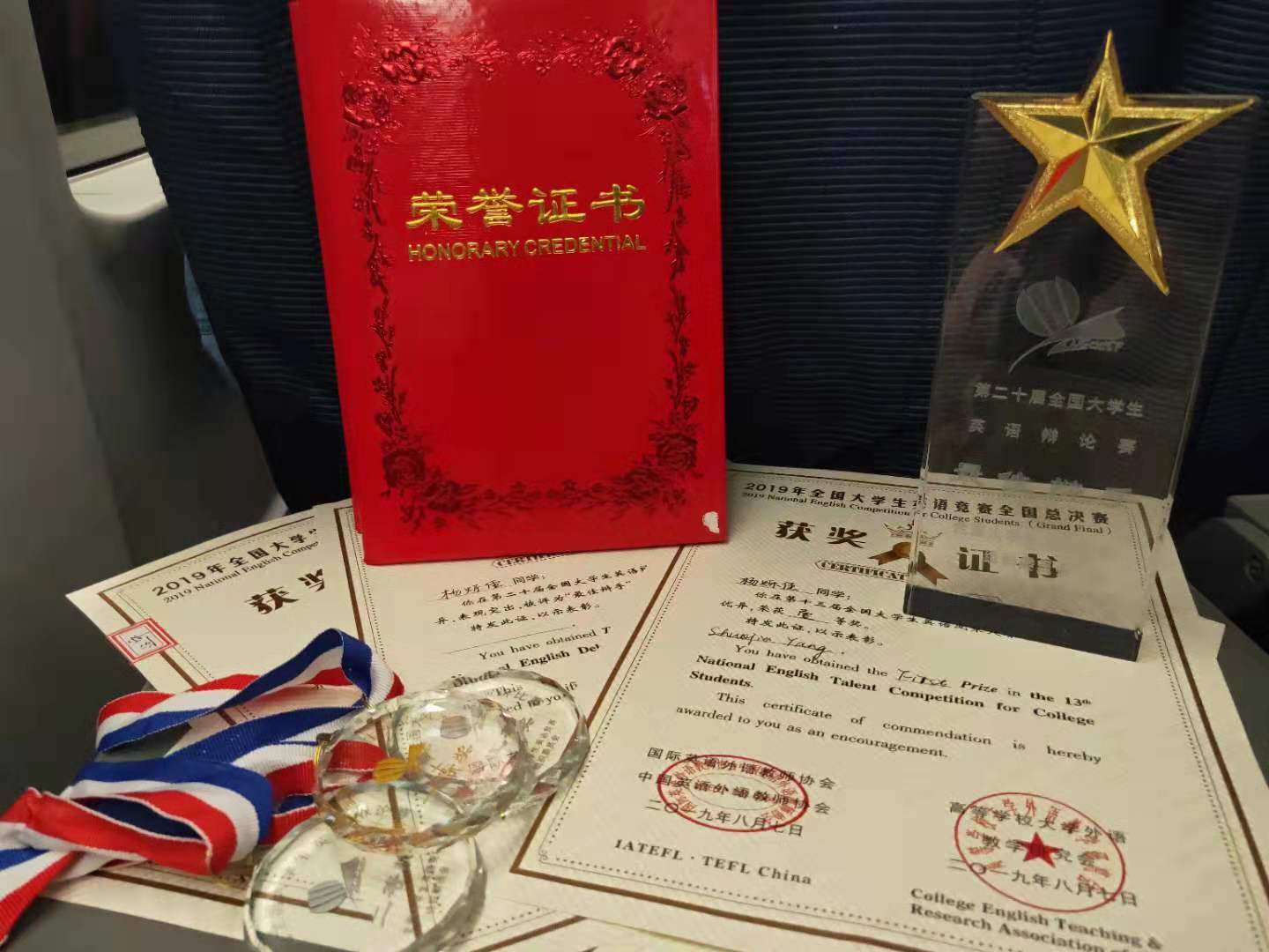 近日,全国大学生英语竞赛(NECCS)全国总决赛在长春举行,来自全国30个省、直辖市、自治区的448名大学生选手组成30个省级赛区代表队参加了本届全国总决赛,英国威廉希官网英国威廉希尔公司官网杨烁佳同学在2019年全国大学生英语竞赛中获得特等奖,并在全国总决赛中喜获佳绩。