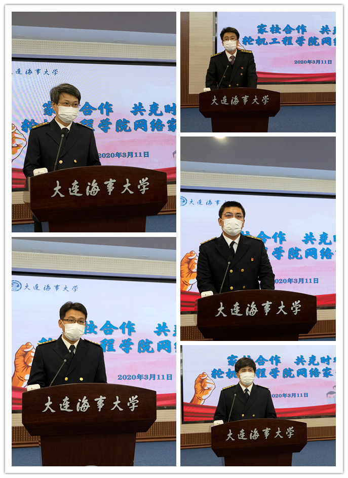 林叶锦介绍了学院整体工作部署。他表示,学院把新学期线上教学当作学院开学期间的核心工作来抓,制定了各种相关应急预案,对全体任课教师和研究生导师进行了动员部署和线上教学培训,开启了学院线上教学模式。同时,对学生学业保障、实践实习、毕业论文(设计)及答辩、研究生培养、就业工作等均作了相应的安排,全力做到“不耽误学业、不耽误毕业、不耽误就业”。希望家长对学校的教学安排给予充分理解,积极配合学校和属地管理,关注学生思想状态,创造良好学习环境,不信谣、不传谣、防诈骗,共同做好学生爱国主义教育和理想信念教育,引导广大轮机学子“胸有大志、心有大我、肩有大任、行有大德”,努力成为全面发展的社会主义建设者和接班人。