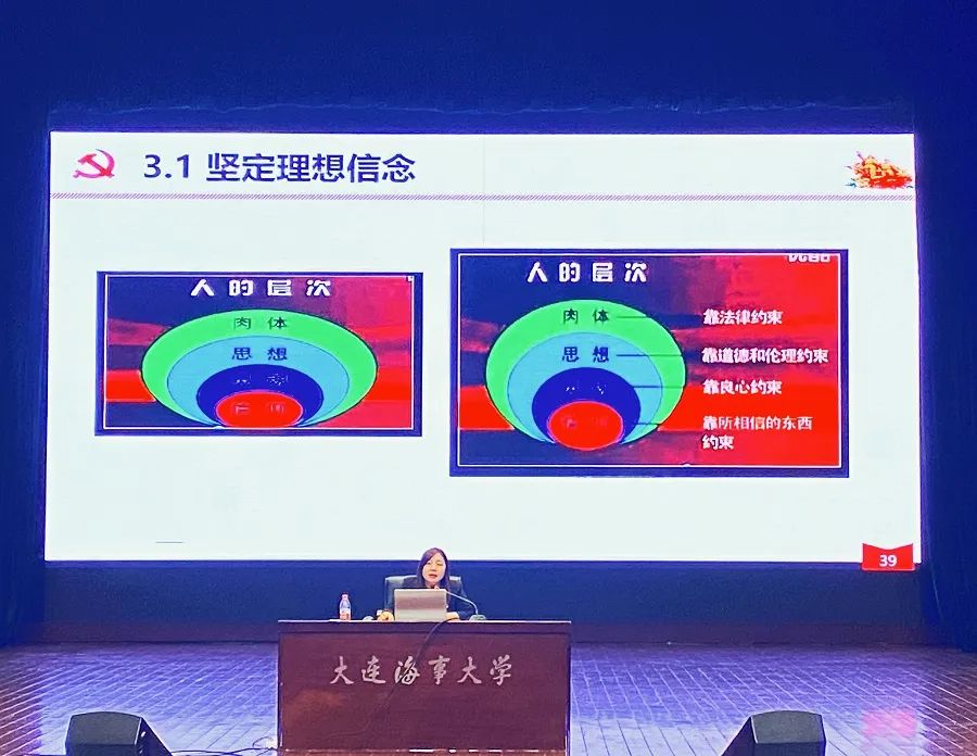 李凤主任带领师生回望历史,镜鉴今日,从理解党性,掌握党性的基本内涵;感悟党性,明确党性的时代特征与基本要求;提升党性,加强共产党员的党性修养等三个方面展开,对革命战争时期、社会主义建设时期和改革开放以后这三个不同时期党员的党性要求进行了详述,诠释了中国共产党人不忘初心跟党走,牢记使命勇担当的伟大情怀。她引用习近平总书记的“六个是否”详细阐述了检验理想信念的客观标准,从坚定理想信念、坚决做到“两个维护”、塑造高尚人格等几个方面回答了共产党人如何加强党性修养的问题。最后,李凤主任提出了心中有大义,心中有大爱,心中有大我三点要求,鼓励青年学生党员坚定不移跟党走,脚踏实地多奉献,在学思践悟中坚定理想信念 在奋发有为中践行初心使命