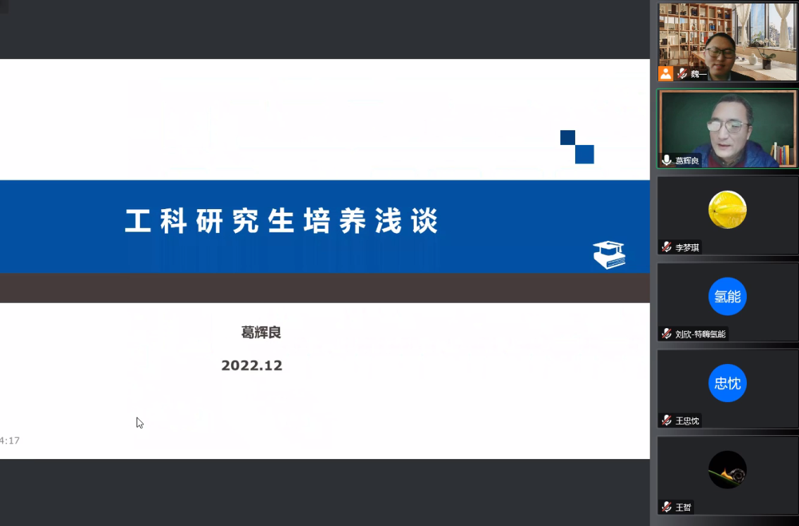 葛辉良研究员结合自己多年的研究生培养经验,围绕研究生培养概述、研究生培养体会以及企业用人角度三个方面进行交流。他强调研究生导师不仅培养研究生的科研创新能力,更要培养研究生厚植家国情怀,树立为科技自立自强而奋不顾身的忘我奉献精神勇攀世界科技高峰、为祖国争光的英雄精神,要立志国家高等教育、科研创新的快速发展作出重要贡献。