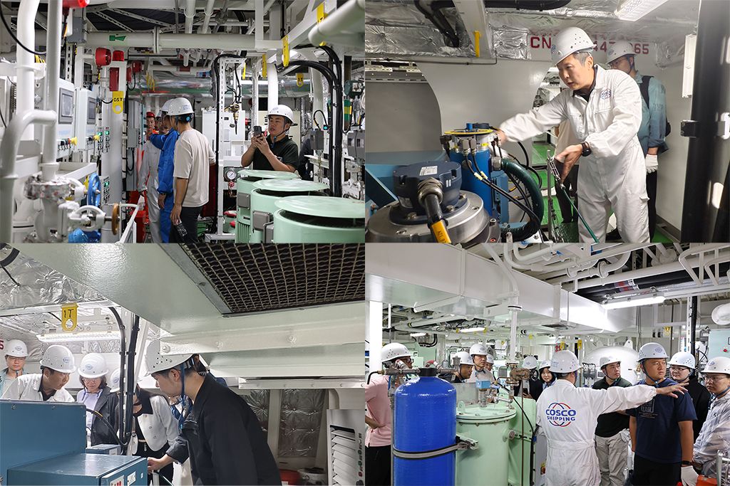 活动伊始,师生们分为两队,分别由监造组张存有老师、大管轮孟维明、二管轮段绪旭以及轮机长池华方、监造组张春来老师、曾鸿老师等经验丰富的讲解教师带领,踏上了一场探索智能航运奥秘的旅程。在驾驶台,大副张斌介绍了智能航行和航海设备仪器概况,随着参观的深入,师生们逐一探访了“新红专”轮的艇甲板、艏部锚绞机、学生房间、实训室、辅助设备间、主机舱、配电板间、主推间以及艉部平台等关键区域。每到一处,讲解教师都以专业的视角,结合生动的语言,介绍了智能机舱和智能运维理念,详细阐述了设备的功能、运行原理以及“新红专”轮在智能航运领域的创新应用。这不仅让师生们对轮船的结构和功能有了更为直观和深入的了解,更激发了他们对智能航运技术的浓厚兴趣与探索欲望。