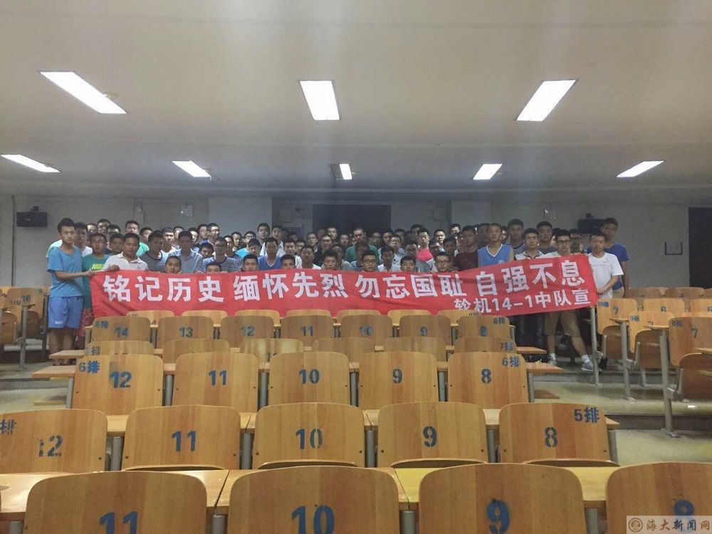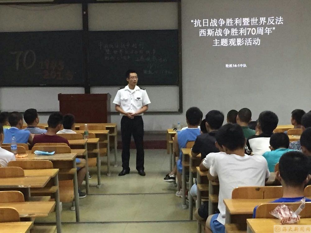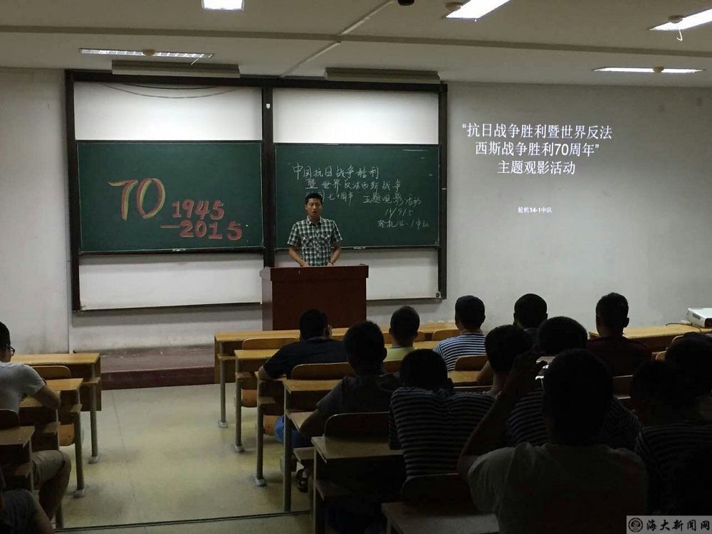 为纪念中国抗日战争胜利暨世界反法西斯战争胜利七十周年,引导学生客观面对历史,理性爱国,英国威廉希尔公司官网轮机2014-1中队于9月5日晚六点在远航楼113教室举行了纪念“中国抗日战争暨世界反法西斯战争胜利七十周年”主题观影活动。中队全体同学、指导员化鹏参加了本次活动,活动由2区队团支书陈杰主持。