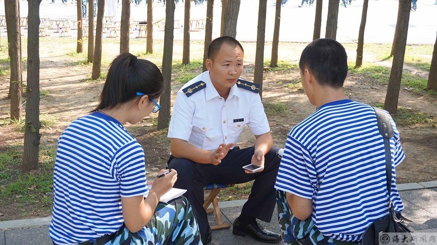 在现场,宣传组采访员首先向黄晓华了解了新生在开始军训阶段的适应情况,黄晓华说经过指导员和骨干对同学们的入学指导、军训动员以及适应性训练,新生们从心理上和体能上都有了较大的进步。接下来,黄晓华谈到了新生军训初期最突出的问题,并说会尽自己的努力与同学们一起找出应对方案,解决问题。当被问到军训的意义时,他将军训意义升华为一种能力,两种意识,即执行能力和纪律意识、服从意识。最后,黄晓华回忆起自己的大学生活,结合自己经过不懈努力成功入选方队的事例,希望新生们坚持自己的梦想,不懈努力,落实“兴我海大,爱我轮机”的口号,争取做一名合格的轮机人。