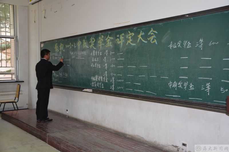 在会议开始前,副指导员薛飞在黑板上公示出学校相关奖学金的项目、金额及分配到中队的名额。接着,指导员张亚培就本次奖学金评定的原则和总体情况进行详细说明。本次奖学金评定大会将B分和综合测评排名在中队前50名的同学召集在一起,本着公平、公开、公正的原则逐一进行评定。