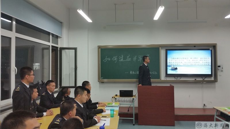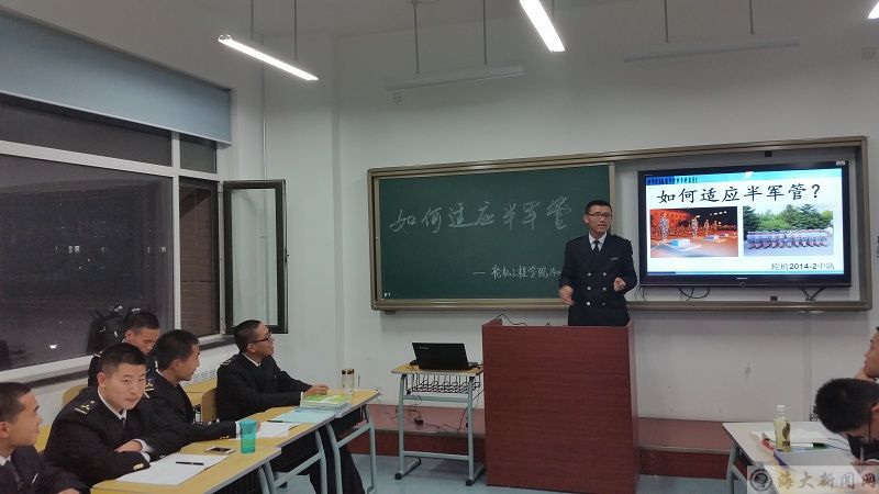 会议开始前,首先由何海洋统计了区队同学在近期半军管生活中遇到的问题,了解了同学们在生活、学习方面遇到的困难。随后,针对同学们的问题,何海洋结合实际与同学们分享了自己近两个多月的半军管切身体会,真挚朴实的语言与同学们产生了共鸣,台下不时爆发出阵阵掌声。紧接着,在何海洋的组织下,同学们围绕如何适应半军管展开了讨论,讨论过程中,每名同学积极发言并依次上台进行了意见交流。最后,何海洋通过PPT讲解方式对同学们的讨论成果进行了总结,对如何更好的适应半军管生活提出了更为可行的建议,在同学们热烈的掌声中,班会圆满结束。