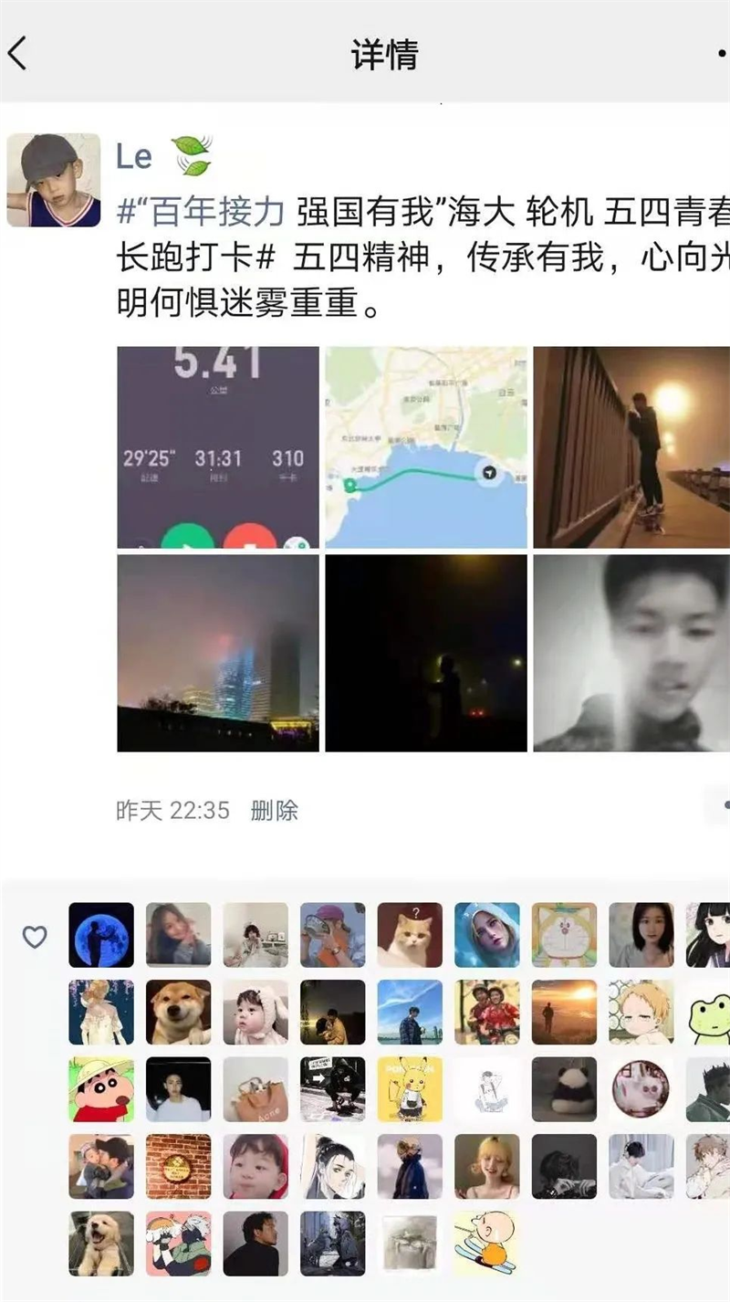 活动参与者在户外、操场等地完成5.4km距离奔跑,在keep等运动APP线上记录,同时在微信朋友圈上传“记录截图+青春寄语”。活动开展以来,学院师生、校友积极参与,包含校友马振麒、教师董景明以及广大轮机学子在内的众多校友、师生在操场、公园、纪念场所等地完成青春长跑活动,同时在朋友圈以#“百年接力 强国有我”海大 轮机 五四青春长跑打卡#为话题,寄语青春,奋进新时代。