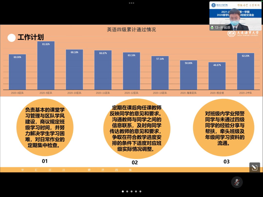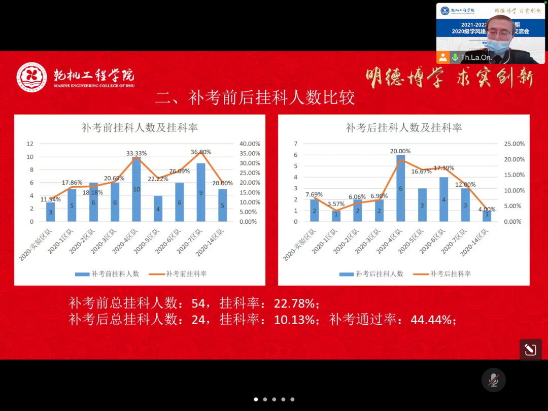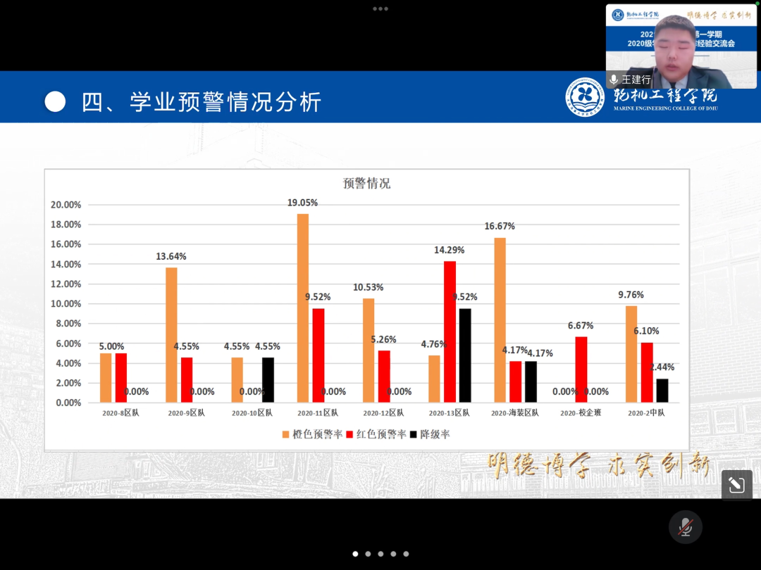 首先,各中队指导员对本中队的学情进行了深入系统地剖析。分别从中队及其区队两个层面,对标对表地围绕“平均绩点、挂科人数、留降级人数、学业预警、四六级通过率”等指标汇报了中队的基本学情。通过运用详实的数据、图表对各类班级成绩产生差别的原因进行了细致分析和阐释,使得参会同学直观了解本区队在本年级的层次和水平,深刻认识自身不足和差距,以便于下一阶段有针对性的做好整改、落实。