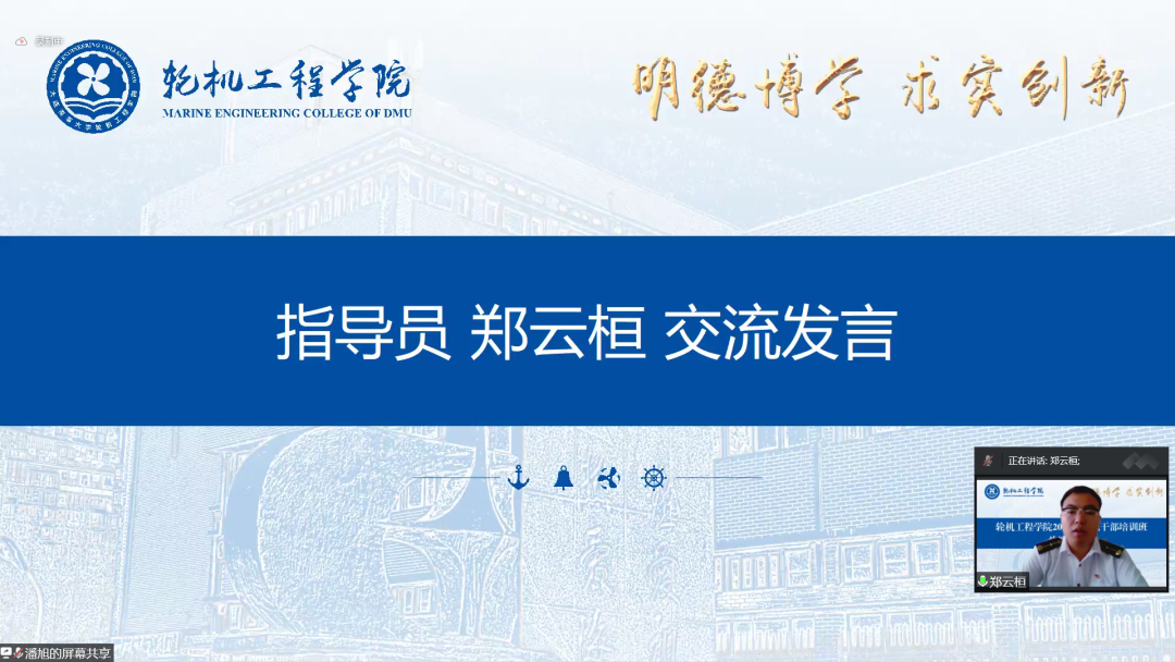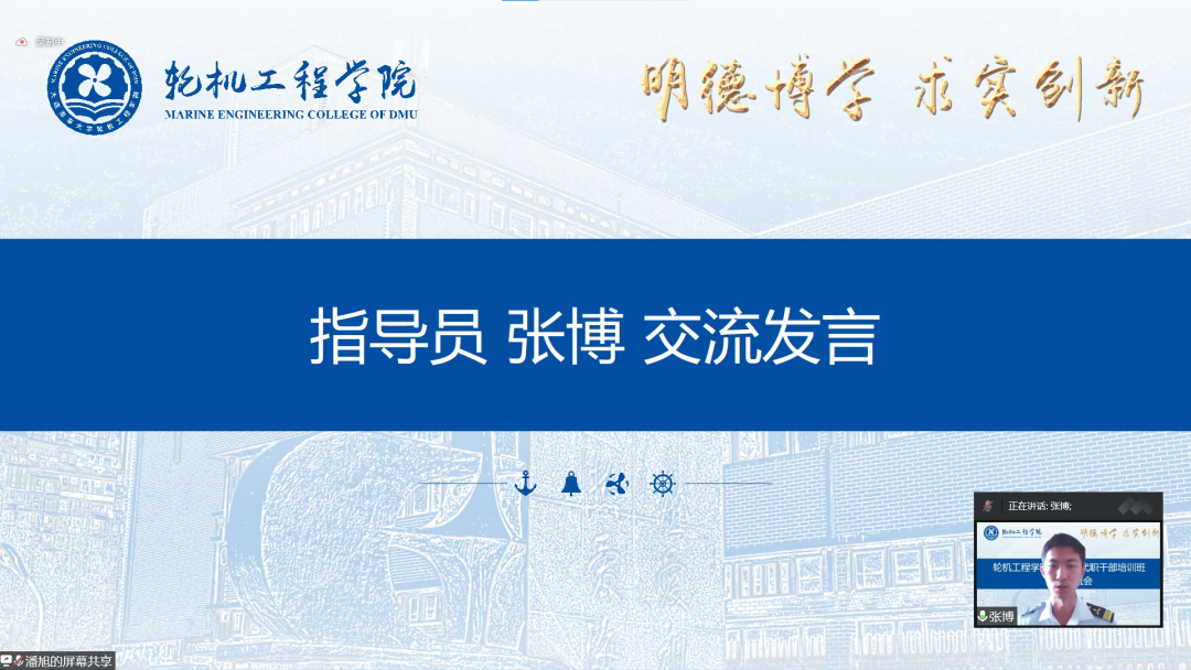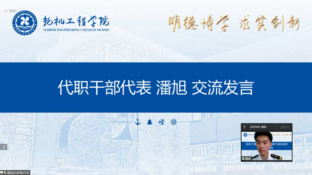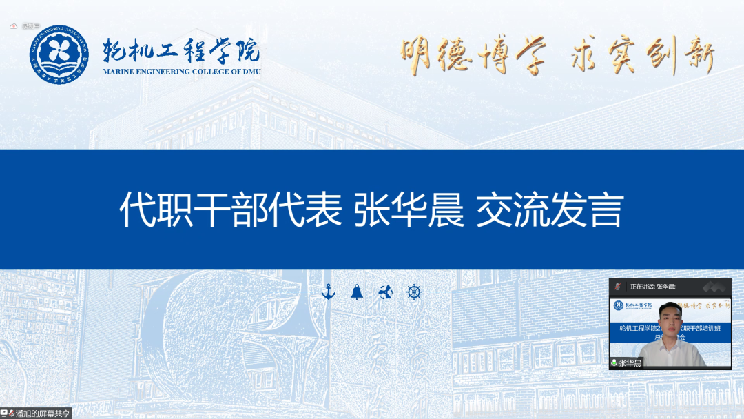 然后,2022级新生指导员张博、郑云桓分别做交流发言。张博表示,本次暑期培训准备充分、内容丰富,全体代职干部思想认识不断提高、综合素质显著提升。他号召代职干部将理论融入实际,永葆攻坚克难的干劲、严于律己的韧劲、突破创新的闯劲,在学思践悟的历练中成长为堪当大任的轮机青年。