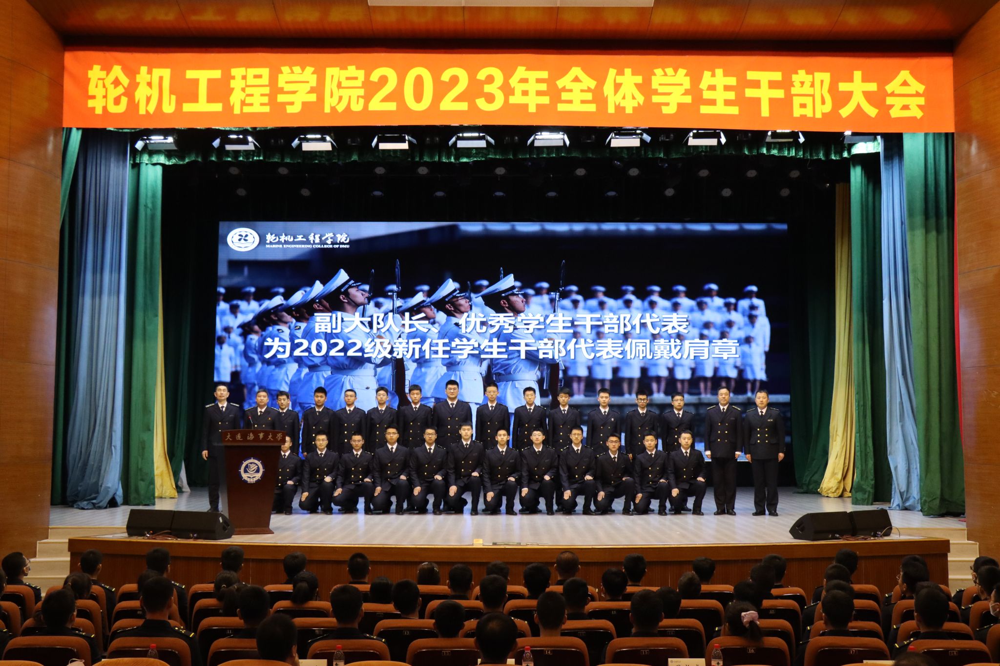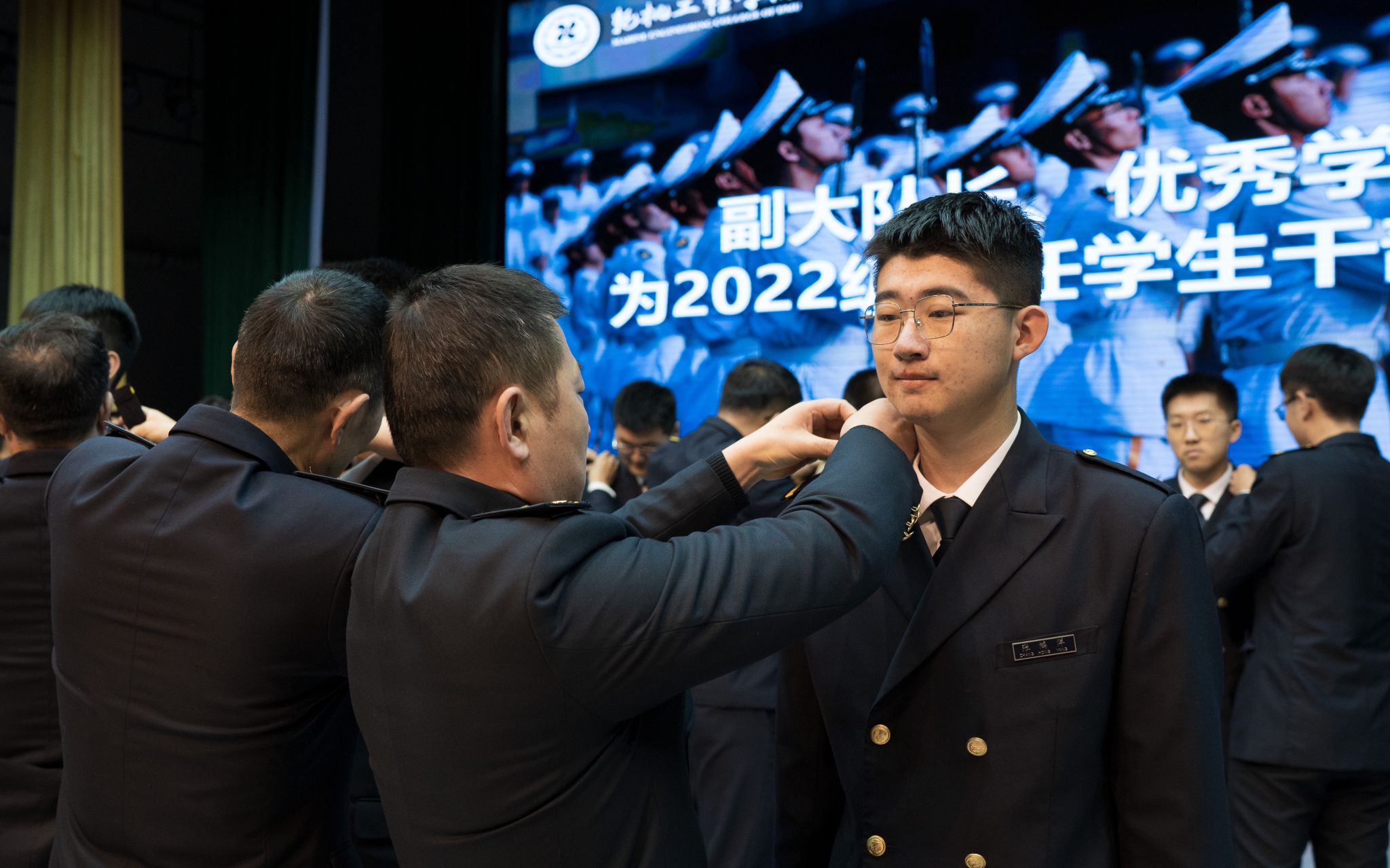 副大队长、优秀学生干部标兵、老生学生干部代表为2022级新任学生干部代表佩戴肩章,激励新任干部同学把选择、坚守、热爱、奉献更好地传承下去。