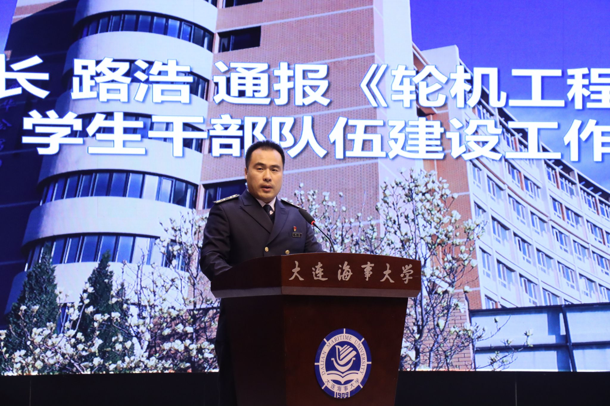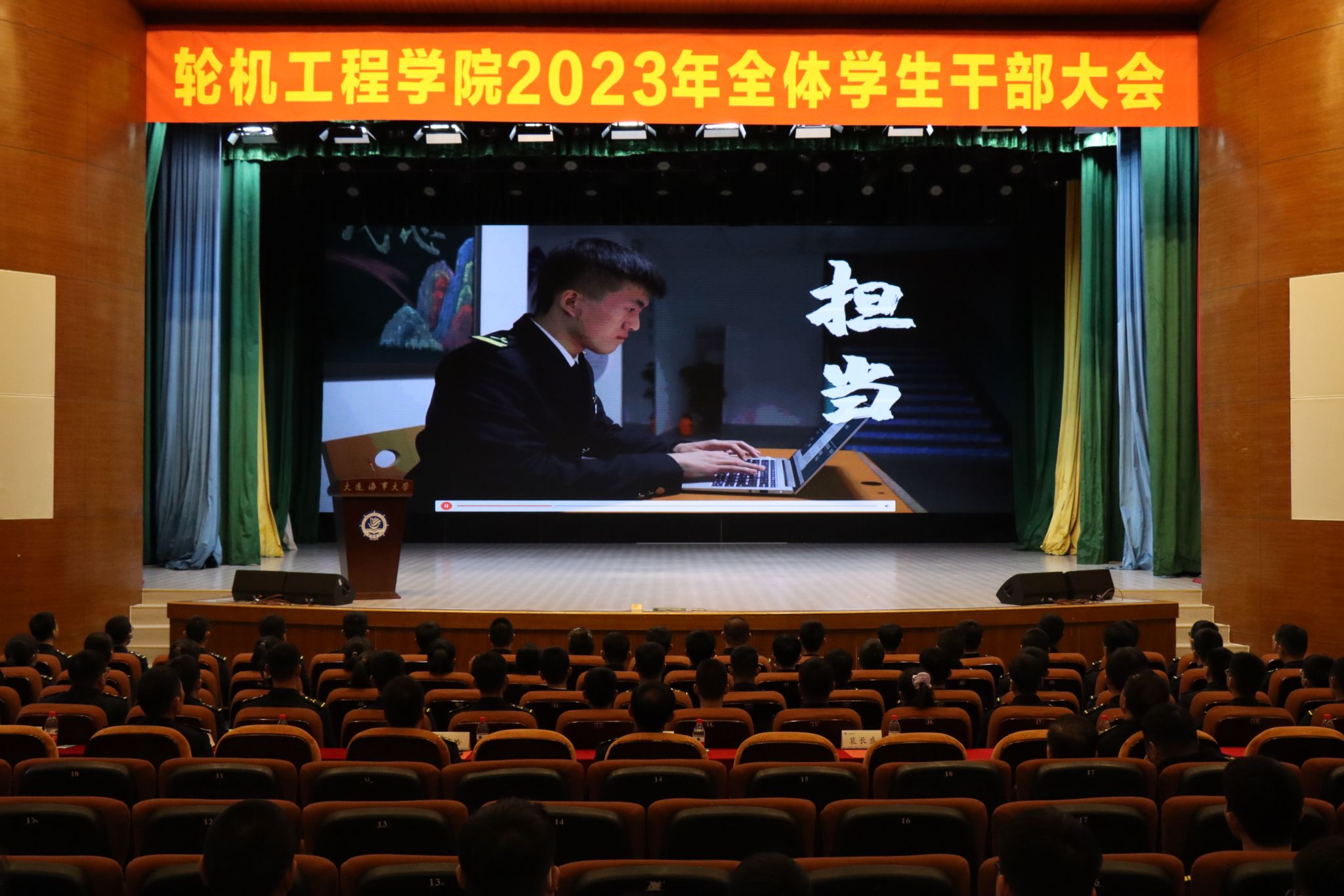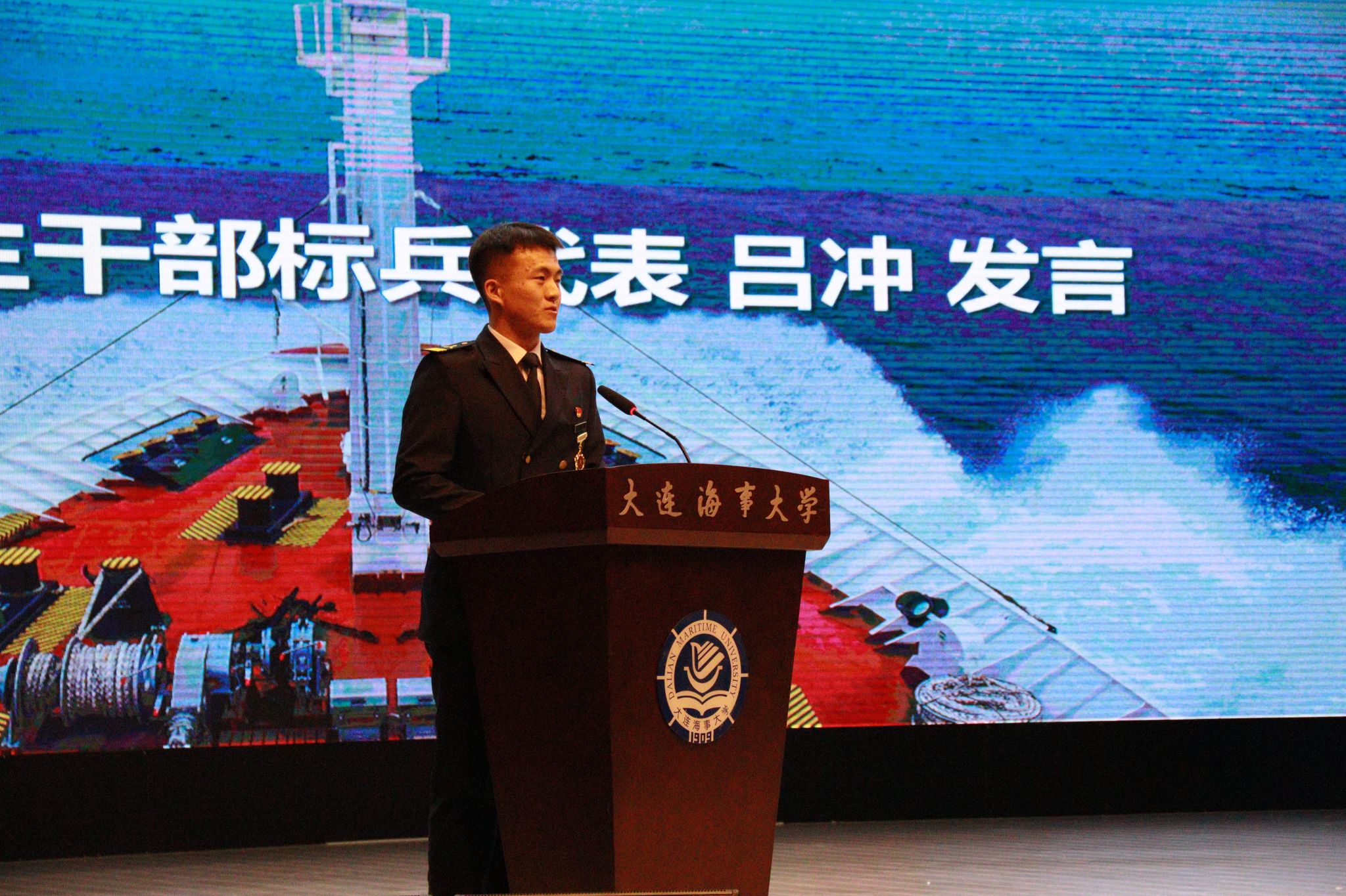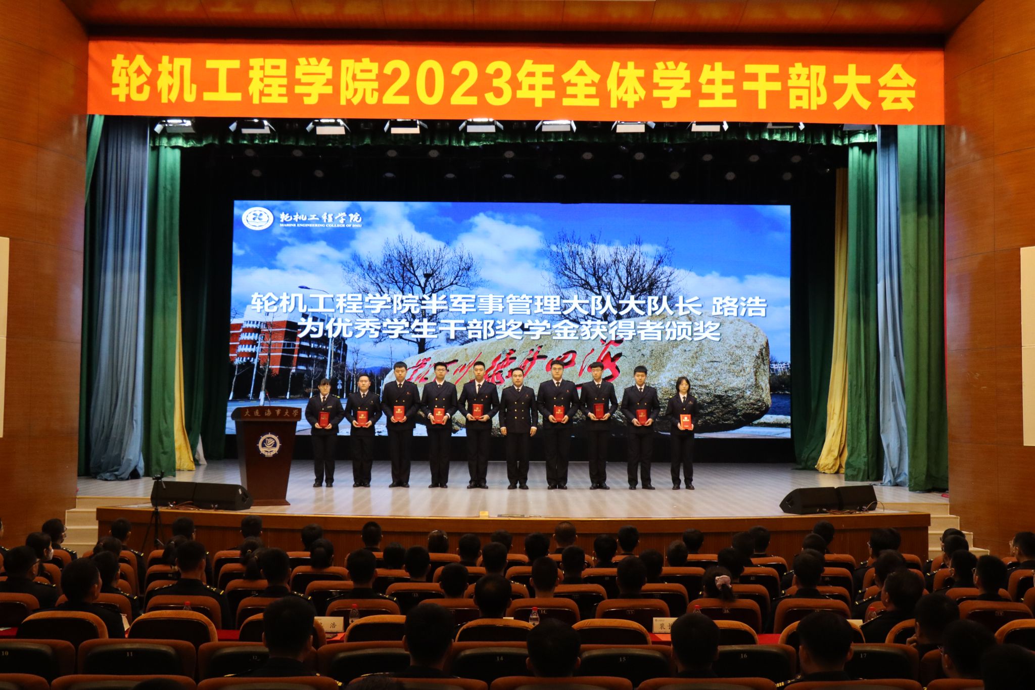 优秀学生干部标兵吕冲代表受表彰学生干部发言。他结合三年来的学生干部经历分享心得感悟,号召全体学生干部做到信念如磐、底子过硬、冲在一线、懂得感恩,在服务同学、服务集体、服务学院的过程中践行奉献、担当责任,奋力成就更好的自己,共同成就更好的轮机!
