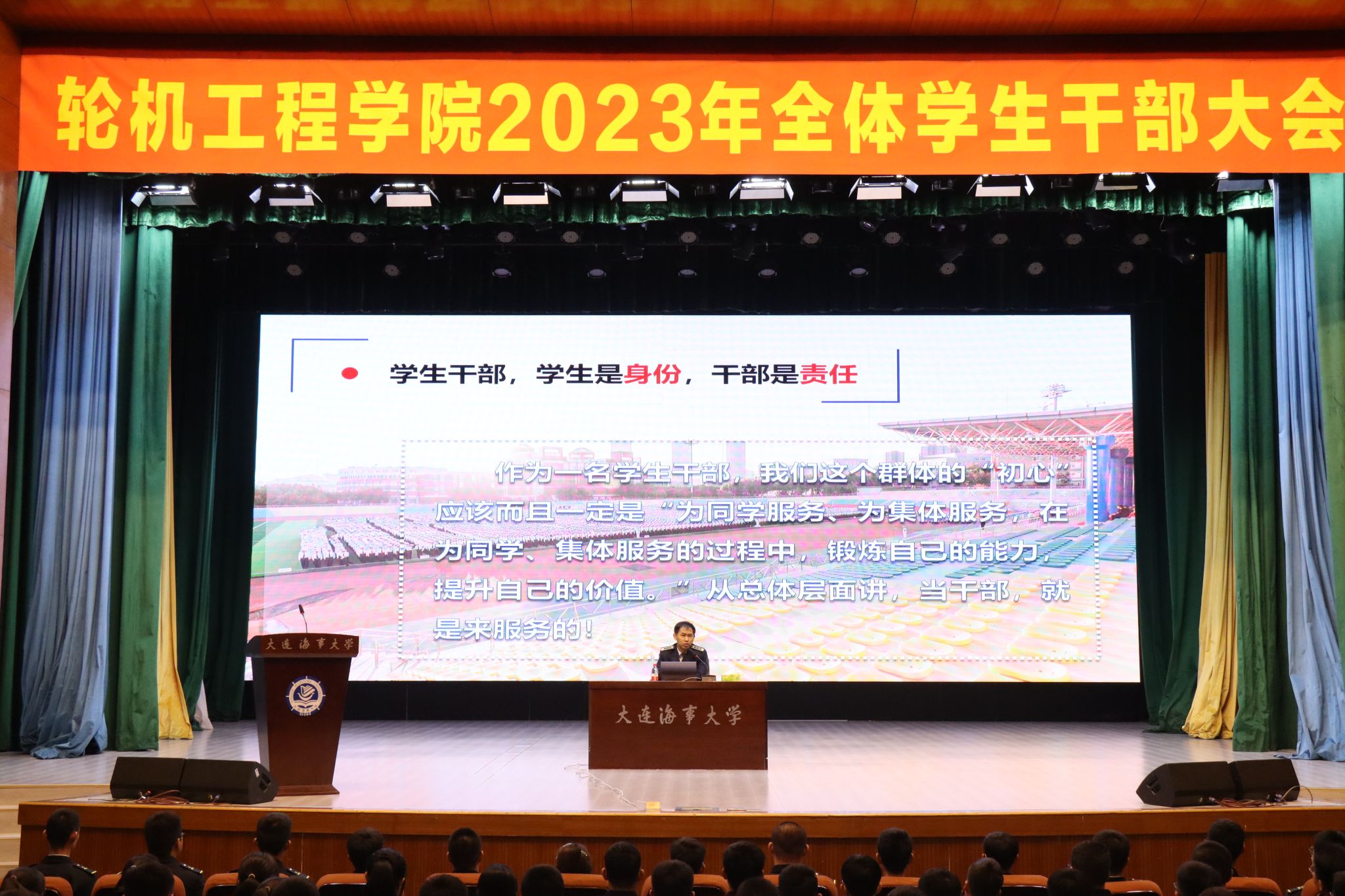 安宁为全体学生干部作《想为敢为,勤为善为,做一名有理想、敢担当的优秀学生干部》主题报告。他结合自身工作经验和实际案例,围绕“我为什么要在这里”、“我为什么能在这里”、“我怎么才能更好地在这里”三个方面和全体学生干部进行深入交流,并从“思”、“立”、“行”三个方面对学生干部提出期许。他勉励学生干部要学会“勤思、善思、反思”,有“真能力”、“真魅力”;讲政治、讲学习、讲胸怀,投入热心服务同学,投入努力完善自己,让青春在奉献自己、发展自己的过程中彰显价值。